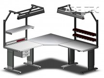 Výšku polohy stola možno prispôsobiť imbusovým kľúčom od 700 do 1100 mm. Systém nastavenia na oboch stranách pomocou hliníkových profilov. Plochy stola sú z 26 mm hrubého antistatického / ESD laminátu, nastaviteľné nožičky poskytujú jemné prispôsobenie roviny stola. Uzemnenie cez ochranný 1 megaohmový rezistor. Možnosť meniť nohy za kolieska.