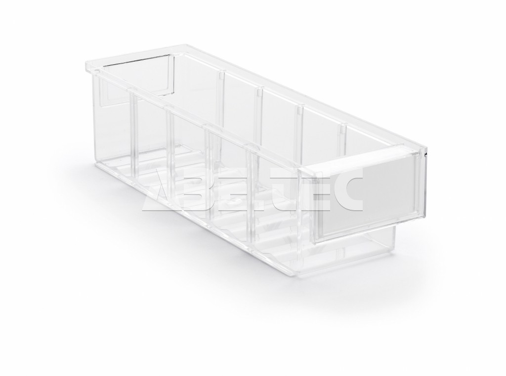 Plastový zásobník s vlnitým dnom, ktorý sa vkladá do úložných skriniek Treston. Rozmery zásobníka 300 x 92 x 82 mm, farba transparentná.