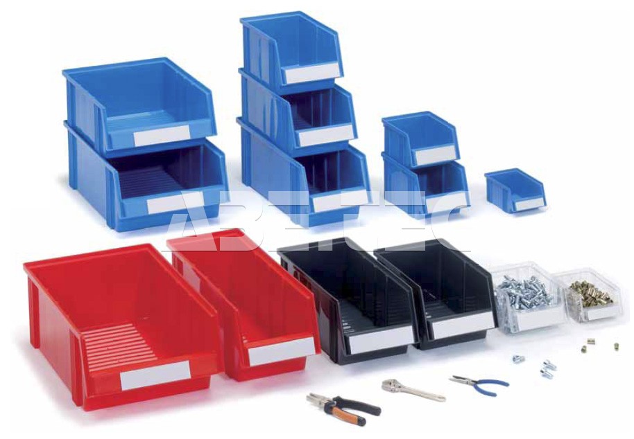 - Stohovací zásobník je vhodný pre stojany, vozíky, koľajnice, stolové stojany, štandardné metrické police a časti skladovacích systémov.
