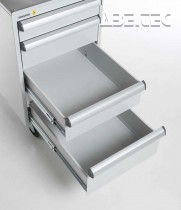 Centrálne uzamykatelné zásuvkové jednotky z vysoko kvalitnej ocele ponúka priestor pre skladovanie nástrojov a malých súčiastok. Montujú sa pomocou držiakov pod dosku stola. K dispozícii sú aj verzie s kolieskami či soklom. Zásuvkové skrinky sú pokryté epoxidovou ochrannou vrstvou (sivá, RAL 7035), centrálnym zamykaním a úchytkou z anodizovaného hliníka po celej šírke zásuvky.