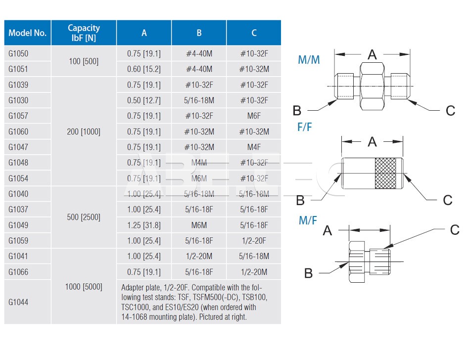 Závitové adaptéry a spojky sú určené na použitie medzi meračom sily a inou prípojkou alebo prípravkom. Pri ich použití spoločne s meračom sily a skúšobným zariadením môžete vytvoriť kompletný testovací systém.